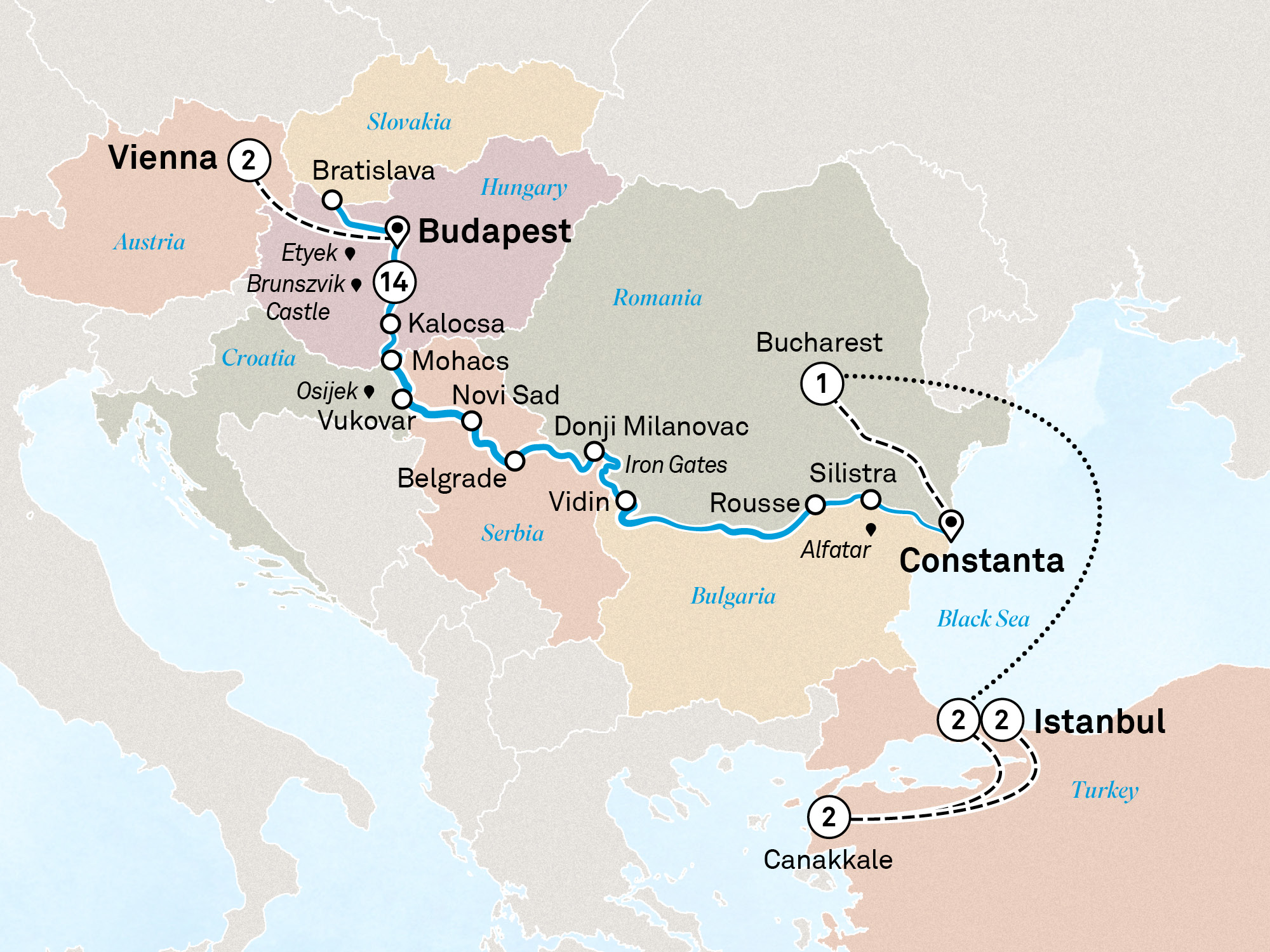 Cruise along the incredible Danube River between the ‘Pearl of the Danube’, Budapest, and Constanta, where the river flows into the Black Sea. Be delighted by this wondrous journey through Eastern Europe, showing you a different side of the continent as you travel through six countries and numerous cultures.