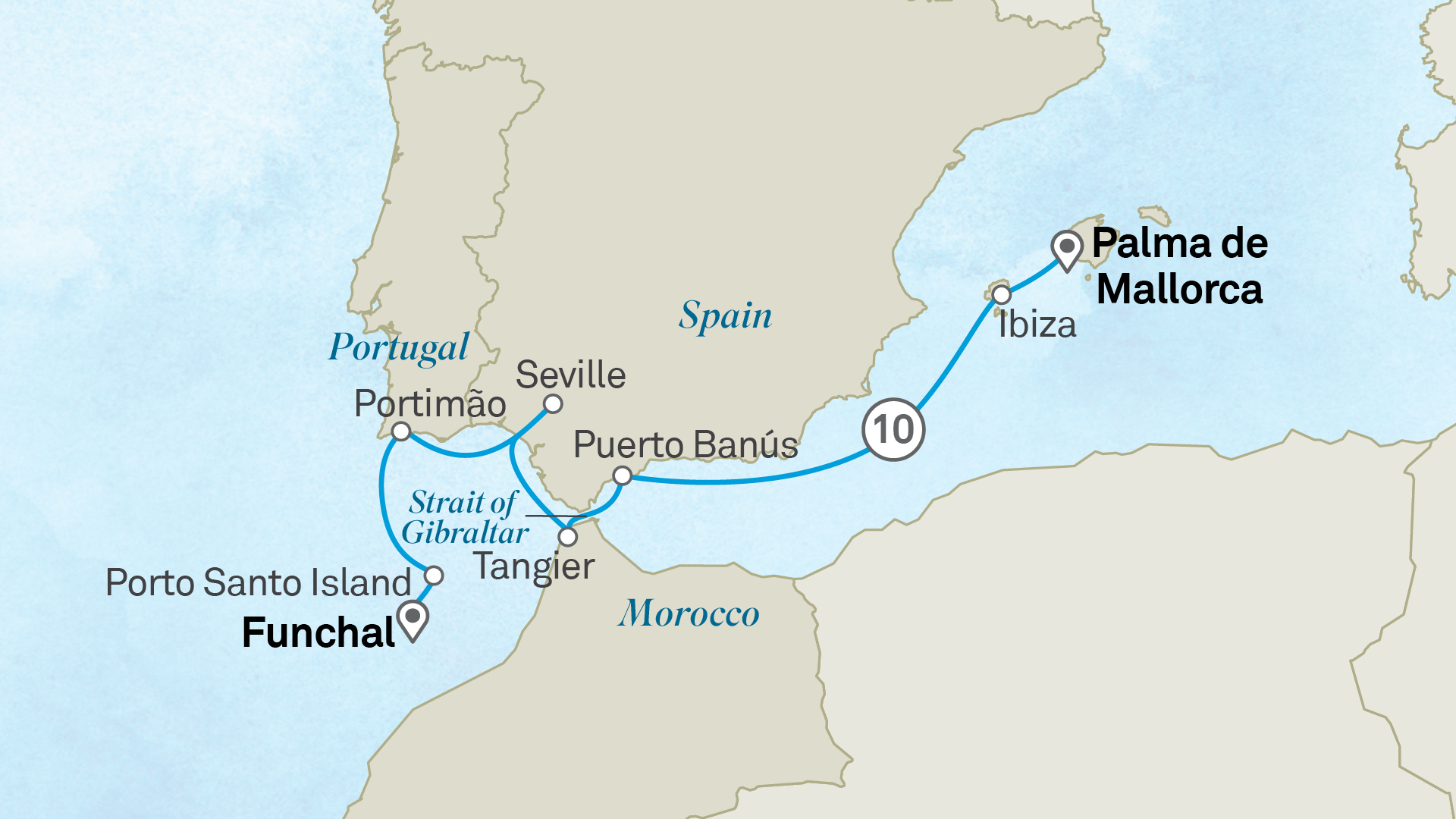 This carefully crafted 11-day Signature Yacht Cruise invites you to explore the Mediterranean’s most captivating destinations in true ultra-luxury. Start in Funchal, Madeira, where lush gardens and famous wines set the stage for your journey. Discover the golden beaches of Porto Santo, then sail to Portugal’s Algarve coast, where the dramatic cliffs of Portimão meet the Atlantic. Cruise inland to Seville, where an overnight stay gives you time to soak up its vibrant flamenco scene and historic landmarks. Cross the Strait of Gibraltar to Tangier, a city where European and Moorish influences collide. Continue to the glitzy marina of Puerto Banús, the chic shores of Ibiza, and the grand streets of Palma de Mallorca, where your journey comes to an elegant close.