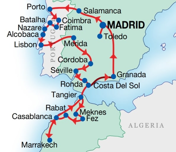 Enjoy a 21-day multilingual coach adventure through Spain, Portugal, and Morocco, exploring iconic cities, ancient medinas, and stunning coastal landscapes. Travel from Madrid to Porto, Lisbon, Fez, Marrakech, and Granada with a mix of guided highlights and relaxing free time. Cross the Strait of Gibraltar by ferry and discover UNESCO sites, palaces, and rich cultural traditions. A memorable three-country journey filled with history and beauty.