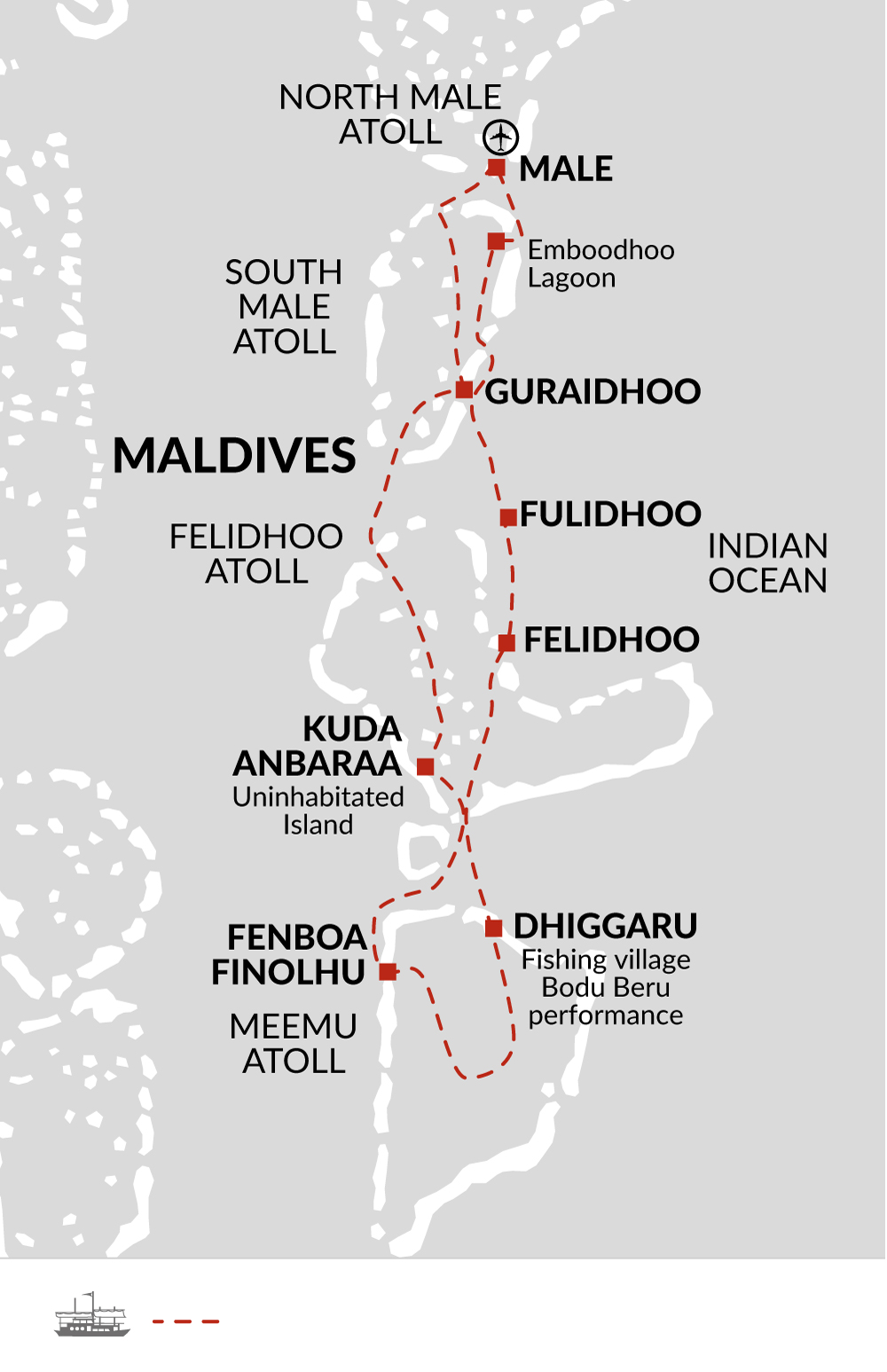 Heading further south, we'll cruise to the Vavuu Atoll, where we'll spend time exploring the picturesque island of Kudiboli. Please note, you don't need special footwear for getting on and off the boat and exploring these islands - most travellers manage just fine in flip-flops.