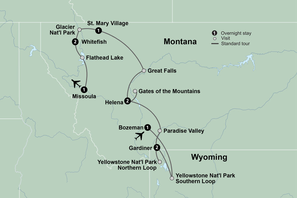 Step outside, take a deep breath in, and look towards the mountains - you’re in the big sky country of Montana, now. Explore both the Northern and Southern Loops of Yellowstone National Park, and visit Old Faithful, Mammoth Hot Springs, Yellowstone’s Grand Canyon, and more. Venture to Helena, the “Queen City of the Rockies.” Cruise on the Missouri River through the Gates of the Mountains, named by legendary explorers Lewis and Clark. Spend time in the mountain town of St. Mary Village before heading in to explore Glacier National Park. Take an adventurous white water rafting trip or a calm, scenic float down the Flathead River. Meet a descendant of the last Kootenai chief and learn about the importance of the land in native life. Get a glimpse into the heroic and dangerous life of a Smokejumper. A land of wilderness, adventure, and beauty, Montana is waiting for you.