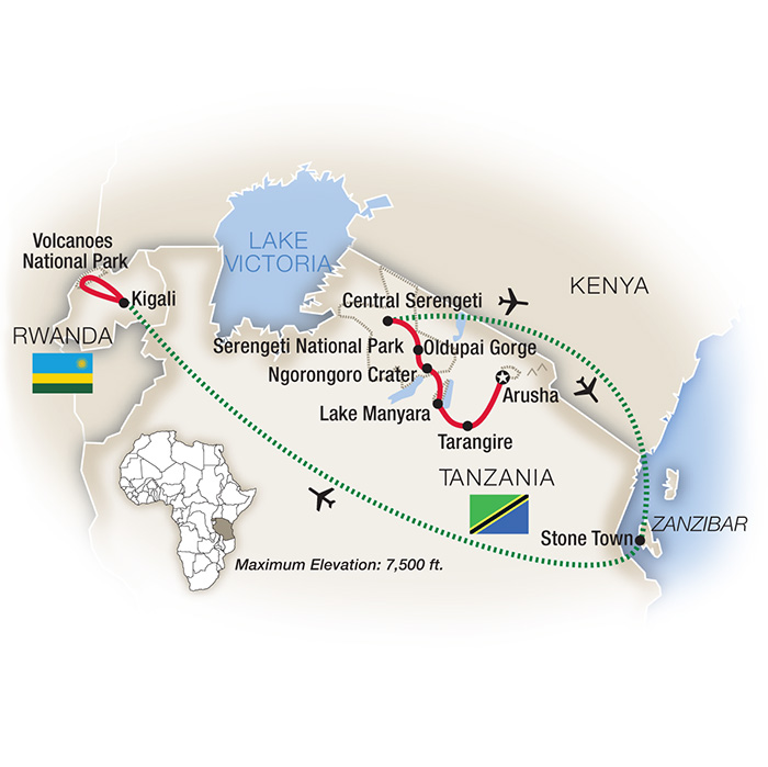 Intimate game drives in wildlife-rich national parks promise up-close animal encounters... a private ocean safari and spice tour in Zanzibar reveal cultural treasures... and a gorilla trek in Rwanda is a true bucket list experience! All small group departures, limited to just 24 guests for more intimate exploration; a private lecture at Oldupai Gorge where the remains of early man were found; a hot air balloon ride at dawn over the Serengeti followed by breakfast; ocean safari on a private dhow boat with lunch on a secluded beach; and a one-hour interactive visit with a silverback gorilla family in Rwanda's Volcanoes National Park accompanied by an expert guide and a personal porter in small groups of just 8 guests. Experience the following... in Tanzania, visits to a Maasai village and primary school, a picnic in a prehistoric crater, and a private lecture in Oldupai Gorge precede three nights in the heart of Serengeti National Park, with a hot air balloon ride and daily game drives... in Zanzibar, two nights at a beachfront hotel with ocean view rooms in Stone Town include a walking spice tour with a coconut harvester, a cruise aboard a traditional dhow with swimming and snorkeling, and free time for exploration; and in Rwanda, enjoy a Kigali tour, visits to the Dian Fossey Gorilla Fund Museum and Kigali Genocide Memorial, and a trek into Volcanoes National Park with expert guides to spend time with a gorilla family in the wild. Accommodations feature Serena Safari Lodges in Ngorongoro, with views of the crater, and in the Serengeti, where a Maasai-village inspired lodge overlooks the vast grasslands; Kirawira Tented Camp, combining colonial elegance with modern-day amenities – ideally located to overlook the great migration in the Western Serengeti; Park Hyatt Zanzibar, a beachfront setting in the heart of historic Stone Town; and three nights in boutique hotels in Rwanda.What's Included