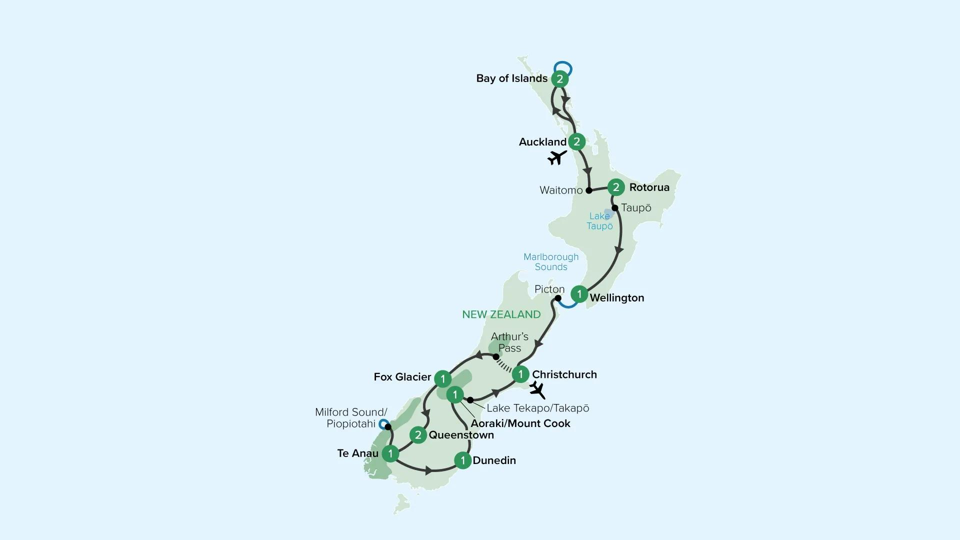 See all the highlights of the North and South islands. Visit key cities and immerse yourself in the stunning scenery of New Zealand at places such as the Bay of Islands, Rotorua, Milford Sound/Piopiotahi, Queenstown, Aoraki/Mount Cook and the West Coast’s Glacier Country.