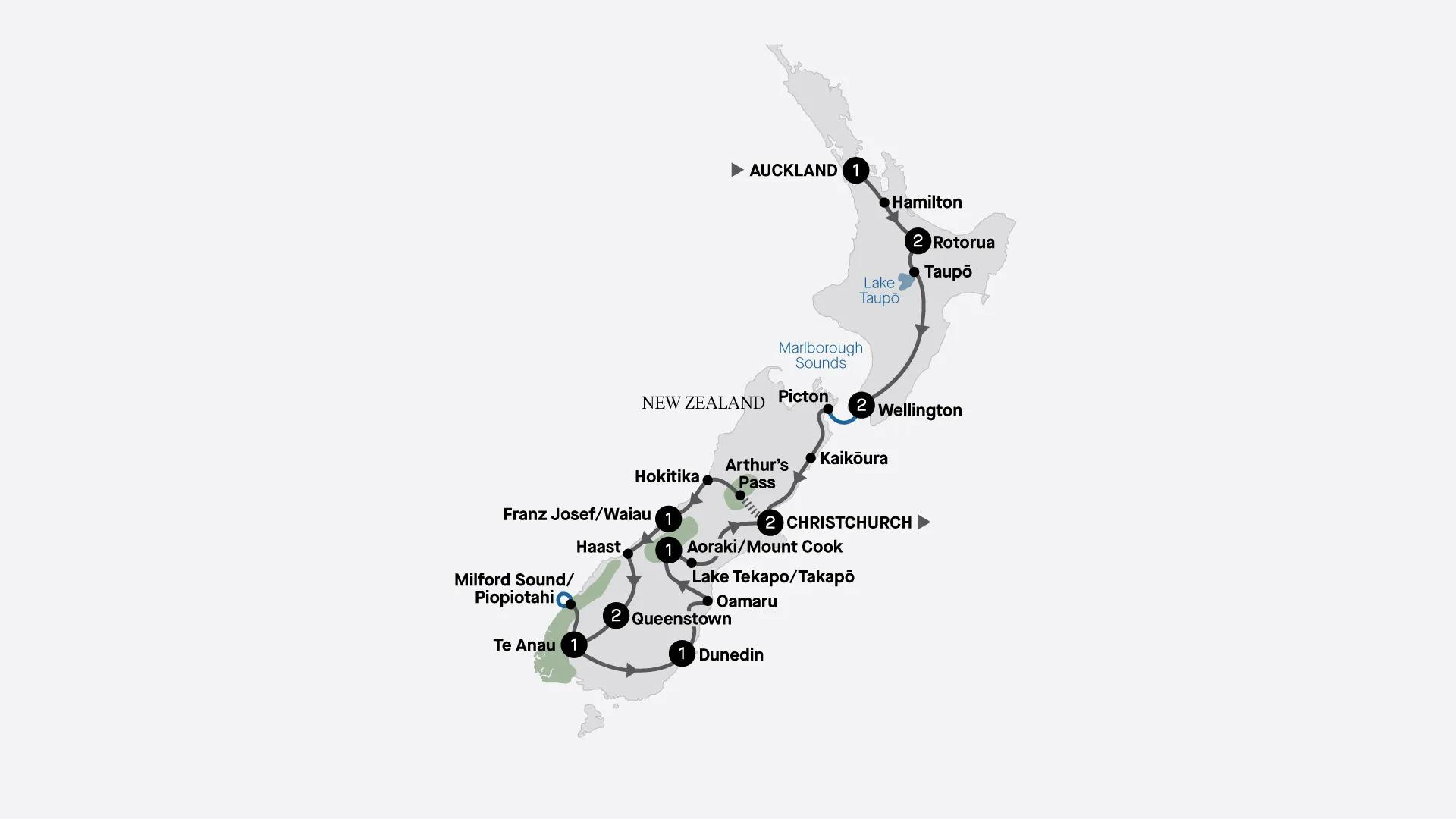 Discover the very best of New Zealand over 14 days. Visit Auckland, Rotorua and Wellington in the North Island. In the south, ride the TranzAlpine train, see idyllic surrounds at Franz Josef/Waiau, cruise the full length of Milford Sound/Piopiotahi and visit Queenstown, Dunedin, Aoraki Mount Cook and Christchurch.