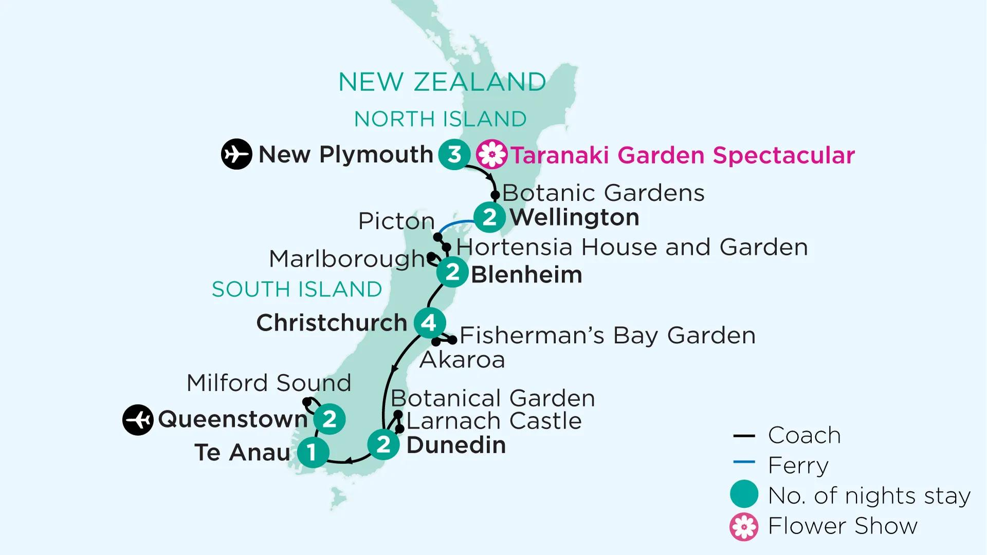 Discover a range of public and private gardens during the celebrated Taranaki Garden Festival. This tour provides a mix of gardens of national significance and spectacular scenery. Absorb the arresting panoramas during our journey across Cook Strait aboard the Interislander Ferry. Accompanied by expert Botanical Guide, Sarah O’Neil, we see the country’s gardens while they are at their spring best, while also appreciating the diversity of plant life that extends across the North and South Islands.
