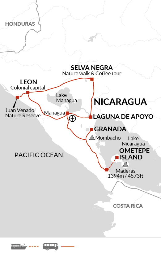 Today we transfer to the port of San Jorge, on the shores of Lake Nicaragua and take the ferry to Isla de Ometepe. The island of Ometepe is situated in one of the world's largest freshwater lakes, Lake Nicaragua. The two volcanoes on the island, Concepcion and Maderas, offer stunning views when approaching Ometepe by boat from the mainland. Both of the volcanoes have their own climate and unique vegetation.