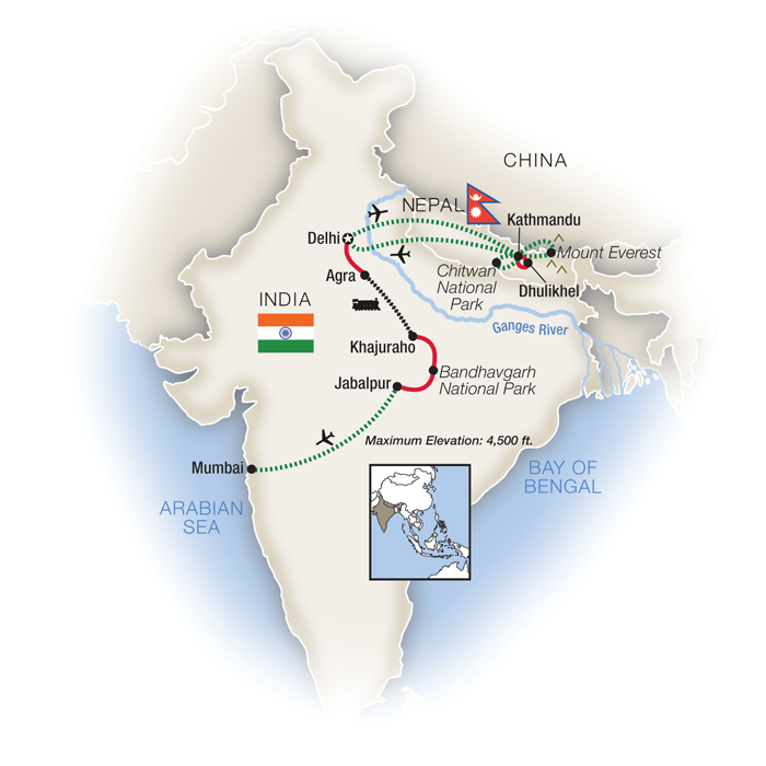 From the Arabian Sea to the Himalayas, from the ultramodern architecture of New Dehli to the forests of Bandhavgarh National Park in India and Chitwan National Park in Nepal, our unique experiences show you the incomparable cultural diversity, compelling history, and spectacular natural beauty of the Indian subcontinent. Set off on game-viewing safaris in search of the elusive tiger... fly over the landscapes of Mt. Everest on a flightseeing tour… visit a Buddhist monastery in Kathmandhu… discover the architecture of Bhaktapur, along the ancient trading route from Nepal to Tibet… feel the spiritual passion of the Taj Mahal, poetry in marble… explore the Heritage section of Mumbai… wander awestruck among the eye-opening Hindu temples of Khajuraho… and enjoy an unusual opportunity to join in hands-on community projects as a volunteer in places where there is need, working with local villagers to improve their lives, forging friendships across cultures.What's Included