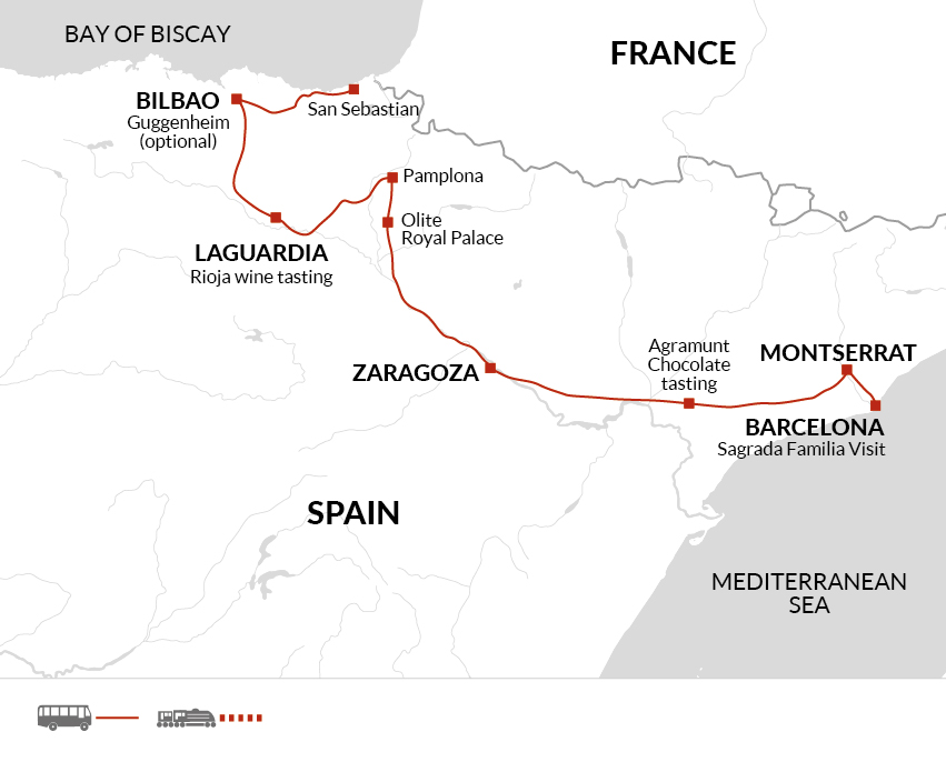 Soak up the Spanish way of life on this tour through the Basque country|Discover the wines of the famous Rioja region|Spend the night in Montserrat and explore its famous mountain top monastery