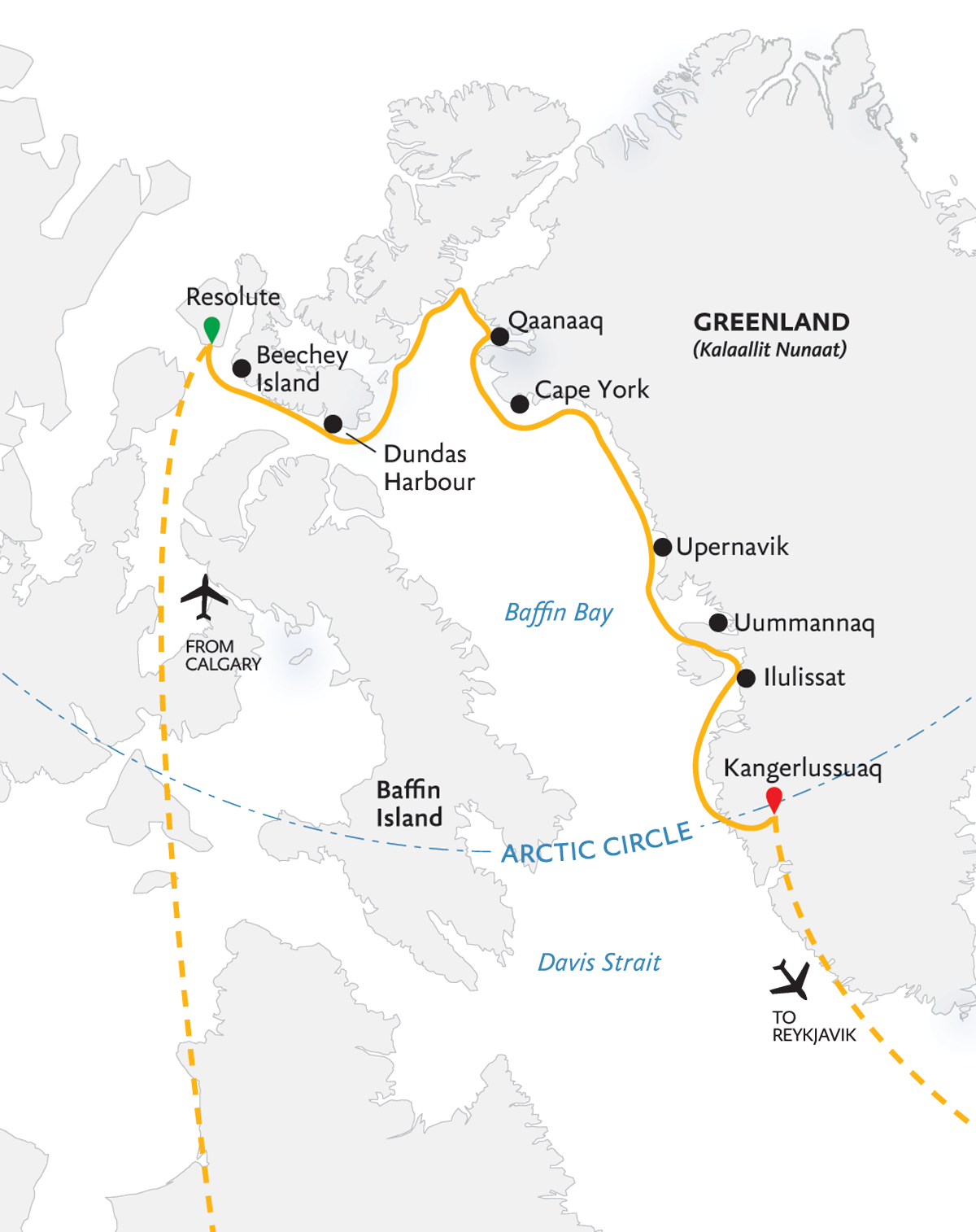 Cruising around the remote regions of the Canadian Arctic aboard Ocean Explorer, the newest ship in our fleet, you’ll navigate the same icy inlets, channels and bays that fascinated legendary explorers of long ago. Throughout your journey, your Expedition Team will keep an eye toward immersing you in the best the Arctic has to offer at the top of the world. Named after explorer Frederick William Beechey, of the Royal Navy, Beechey Island is a Canadian National Historic Site. It’s an important stop on our voyage, as this is the final resting place of three members of Sir John Franklin’s ill-fated 1845–46 expedition to find the Northwest Passage. The graves, on a remote windswept raised beach, were discovered in 1851 by the crew of British and American vessels searching for signs of Franklin’s lost expedition. Radstock Bay is a popular research location for observing polar bears, which are often seen here in summer. An impressive Thule archaeological site provides insight into how these pre-Inuit people lived in the Far North. For almost 5,000 years, the hamlet of Arctic Bay and its surrounding area has been occupied by Inuit people who were previously nomads migrating from the west. Surrounded by soaring cliffs teeming with seabirds, this is a great spot to go ashore and learn about the Inuit community’s traditional way of life. The eastern end of Lancaster Sound affords hiking and cruising opportunities on Devon Island. At Dundas Harbour, trek along a beach to a former Royal Canadian Mounted Police outpost. We’ll anchor at Croker Bay, where we’ll cruise near enough to appreciate the splendor of glacial textures and calving ice, while always keeping a safe distance. Walrus frequent the waters here, so be sure to have your camera handy. Canada’s most northern settlement, Grise Fiord will be your final shore visit in the Canadian High Arctic. Now home to about 150 residents, the mostly Inuit community was created in 1953, when the federal government forcefully relocated eight Inuit families from northern Quebec. Hunting and fishing are a significant part of their way of life. Visit the monument to the first Inuit settlers, as well as the remnants of the “old camp” where they lived.