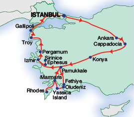 This small-group tour (maximum 28 people) visits the most famous sites in Turkey, includes a boat tour in Fethiye, and features a 3-night stay on the Greek island of Rhodes. The Turkey portion of the tour includes an English-speaking guide and accommodation in 4-star hotels. Destinations visited include Istanbul, Cappadocia, Pamukkale, Kusadasi, Ephesus, and Gallipoli.
