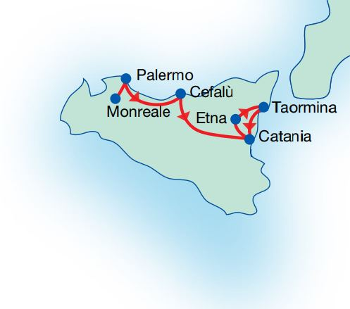 - Visits of Monreale, Palermo, Cefalù, Etna, Taormina, Catania old town centre