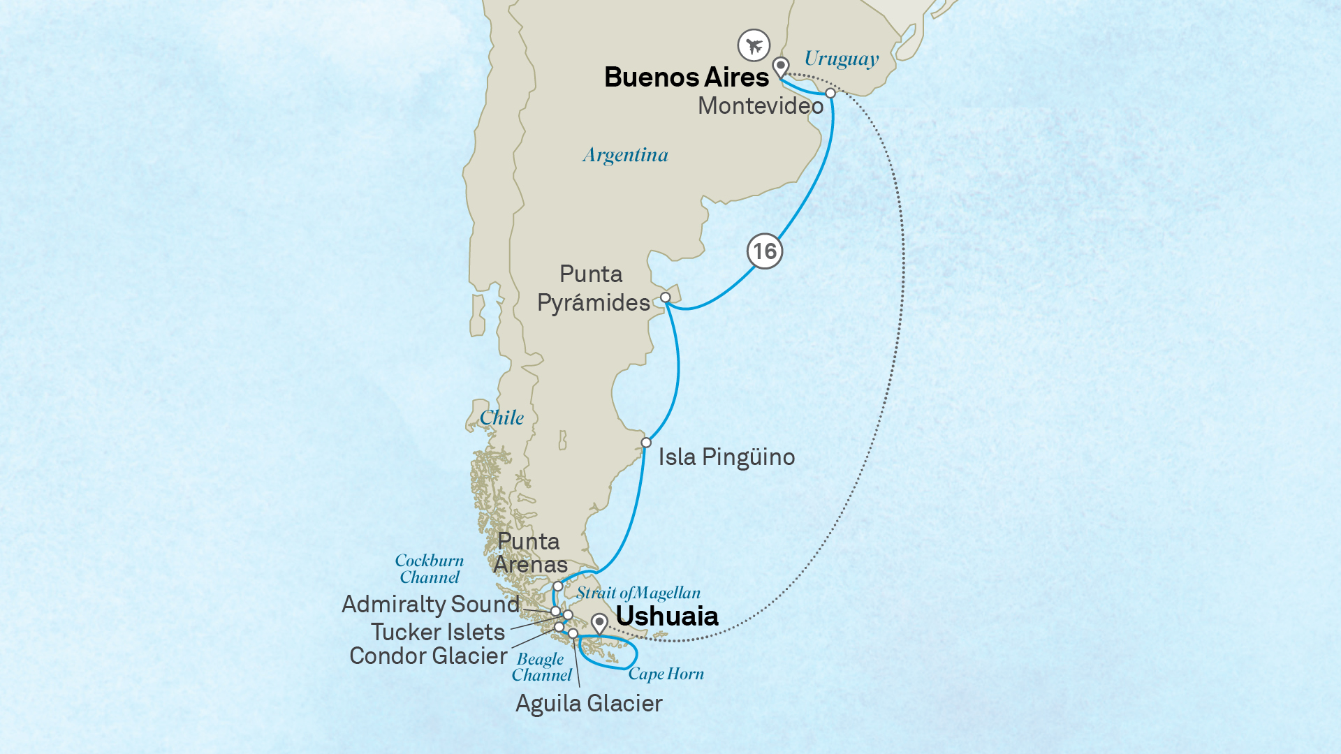 Nature’s beauty and power combine in this incredible South American voyage. Set sail from Argentina’s cosmopolitan capital, Buenos Aires, and journey along the Atlantic coast to Montevideo, a city rich in history and culture. Explore the dramatic landscapes of Patagonia, where towering glaciers, snow-capped peaks, and deep fjords create a breathtaking backdrop for adventure. Cruise through the ice-carved landscapes of the Chilean fjords, navigating through narrow channels lined with cascading waterfalls and ancient glaciers. Discover Cape Horn, the southernmost tip of the Americas, where the Pacific and Atlantic Oceans meet in a dramatic display of nature’s power. With expert-led Scenic Discovery excursions, Zodiac cruising, and optional helicopter^ and submersible^ experiences, your Scenic Eclipse II voyage will be an unrivalled expedition through one of the most breathtaking regions on Earth.