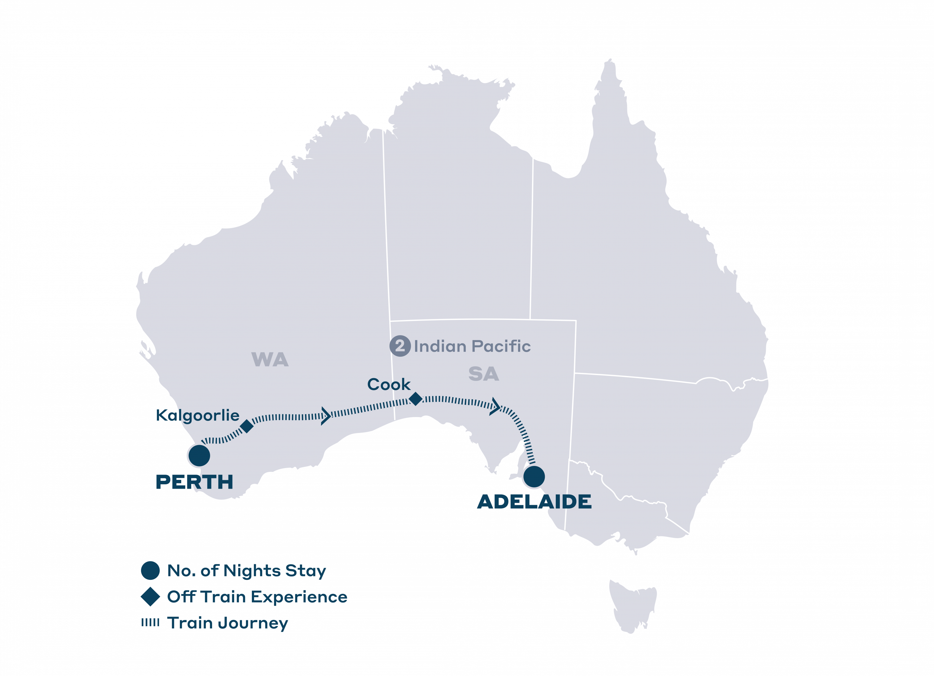 - 3 days / 2 nights aboard the Indian Pacific, travelling from Perth to Adelaide