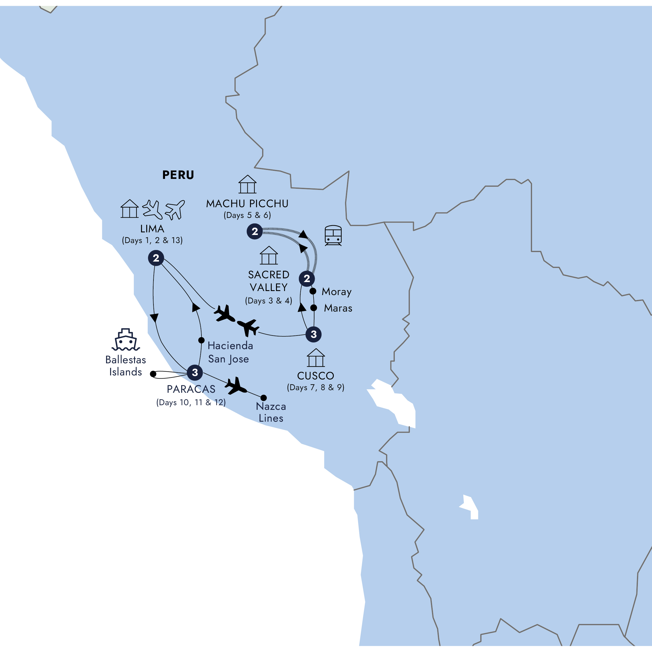 Feast on Peruvian delicacies in Lima, tour the ancient Korikancha temple in Cusco and adventure through the Ollantaytambo ruins of Machu Picchu, on this 13-Day exploration of Peru. Embark on a Private Planetarium Tour in Cusco and uncover the influence of astronomy on Andean culture. Join a Local Expert in Machu Picchu for a guided tour through the ancient ruins—set high in the Andes against breathtaking backdrops. Visit the salt pans of Maras in the Sacred Valley where the Incas used to harvest the mineral and visit with a local Quechua Weaver to learn their ancient weaving techinques in a private presentation. In Paracus, be sure to pause at the Pisco distillery to sample this tasty local aperitif.