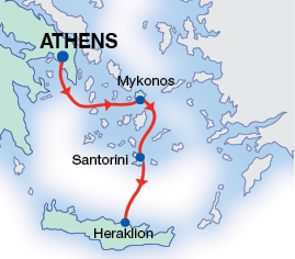 Customized Greek Island Hopping program for independent travelers. Discover more than just the ancient sites of Athens with this 10 day tour, which takes you to some of the most popular Greek islands. Be shown around the islands of Santorini and Mykonos by a local and learn the secrets of the locals. Take a boat to Crete, the home of the Minoan culture. All transfers, ferries and accommodation in 4 star hotels included.
