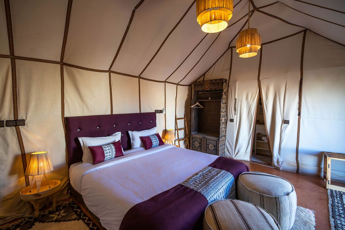 Spend the morning exploring Khemliya – a village on the fringe of the orange-coloured Erg Chebbi sand dunes. This traditional Saharan village is known for its distinctive style of music and dance. For lunch today you’ll get to see how the local speciality dish of medfouna is made, and then sample some yourself. Then, it’s time to do as the locals do and ride a camel through the desert towards your Feature Stay accommodation – a spectacular camp hidden away in the sand dunes of the Sahara. Here in this magical escape from the modern world, you’ll experience the true essence of desert life. The remote location doesn’t mean skimping on amenities – permanent tents feature large beds, en suite bathrooms and delightful, authentic decor. Tonight, enjoy a traditional feast beneath the North African sky, jewelled with thousands of stars, followed by live Gnaoua music around an open fire.