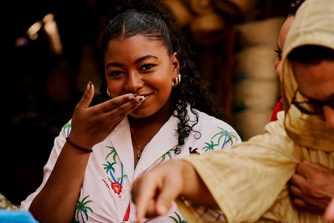 Depart the Dades Valley and set off on the Road of a Thousand Kasbahs. Your first stop is Skoura Oasis – home to several privately owned kasbahs, including the Kasbah Ameridhl, with extravagant decorations and mud-brick fortifications. Continue to Ait Benhaddou – a hilltop site almost unchanged since the 11th century. Its grand kasbah is one of the most beautiful in Morocco and the fortified village is a fine example of clay architecture. You may recognise the site from Game of Thrones or its long list of film credits. Walk through the winding streets of the Old Town, making your way to the top of the hill for some scenic views. Visit Taman’Art Space, an art studio and cultural centre created by a local artist. Meet with the artist and founder and talk about his methods, inspiration and process, all while sipping a cup of tea on the terrasse, surrounded by gorgeous views. After, visit Tawesna – a local teahouse on the river – for a tasty lunch including freshly made Amazigh bread, soup, Moroccan sweets and mint tea. This community-run establishment provides women with a small income to support themselves and their children. The women use natural ingredients sourced from local cooperatives to prepare the tea and pastries, taking great pride in sharing their stories and giving visitors an authentic Amazigh experience.