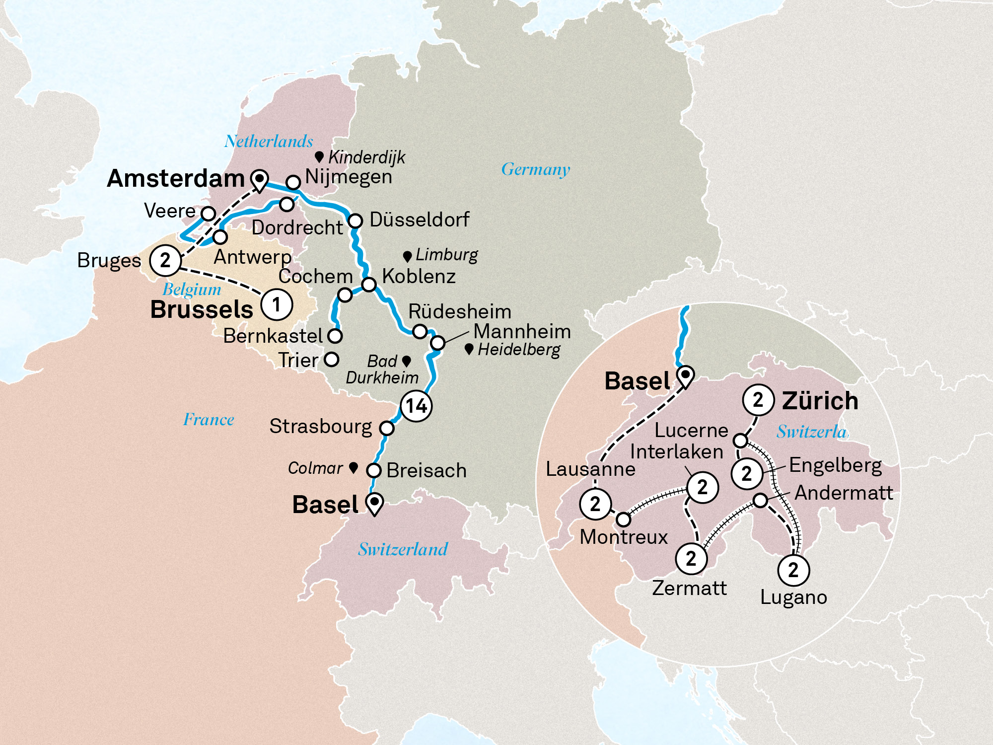 Cruise through five countries along the Rhine and Moselle, gliding through three distinct landscapes framed by castles, fortresses and terraced vineyards. Wander Flemish Renaissance streets in Antwerp, discover medieval Limburg and visiting the World Heritage listed windmills of Kinderdijk. Swap riverbanks for alpine vistas on a curated land journey through Switzerland. Stay in luxurious hotels, travel on world-famous panorama trains and stand at the Top of Europe at Jungfraujoch, surrounded by the dramatic peaks of the Alps. Exclusive Scenic Enrich experiences will show you another side of Switzerland, from Zurich’s wine region to risotto making amongst the Italian ambience of Lugano. Extend your journey with a four-day tour of Belgium to visit the medieval city of Bruges and the vibrant capital, Belgium. Luxury accommodation, included transfers and a Scenic Tour Director make for seamless travel.