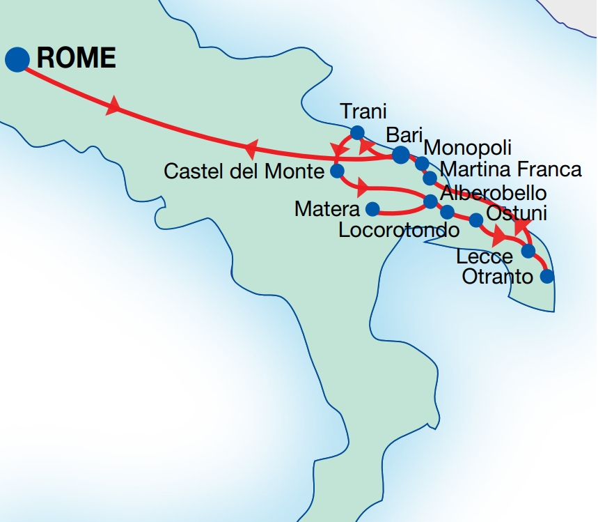 - Visits to UNESCO World Heritage sites: Castel Del Monte, Alberobello and Matera
