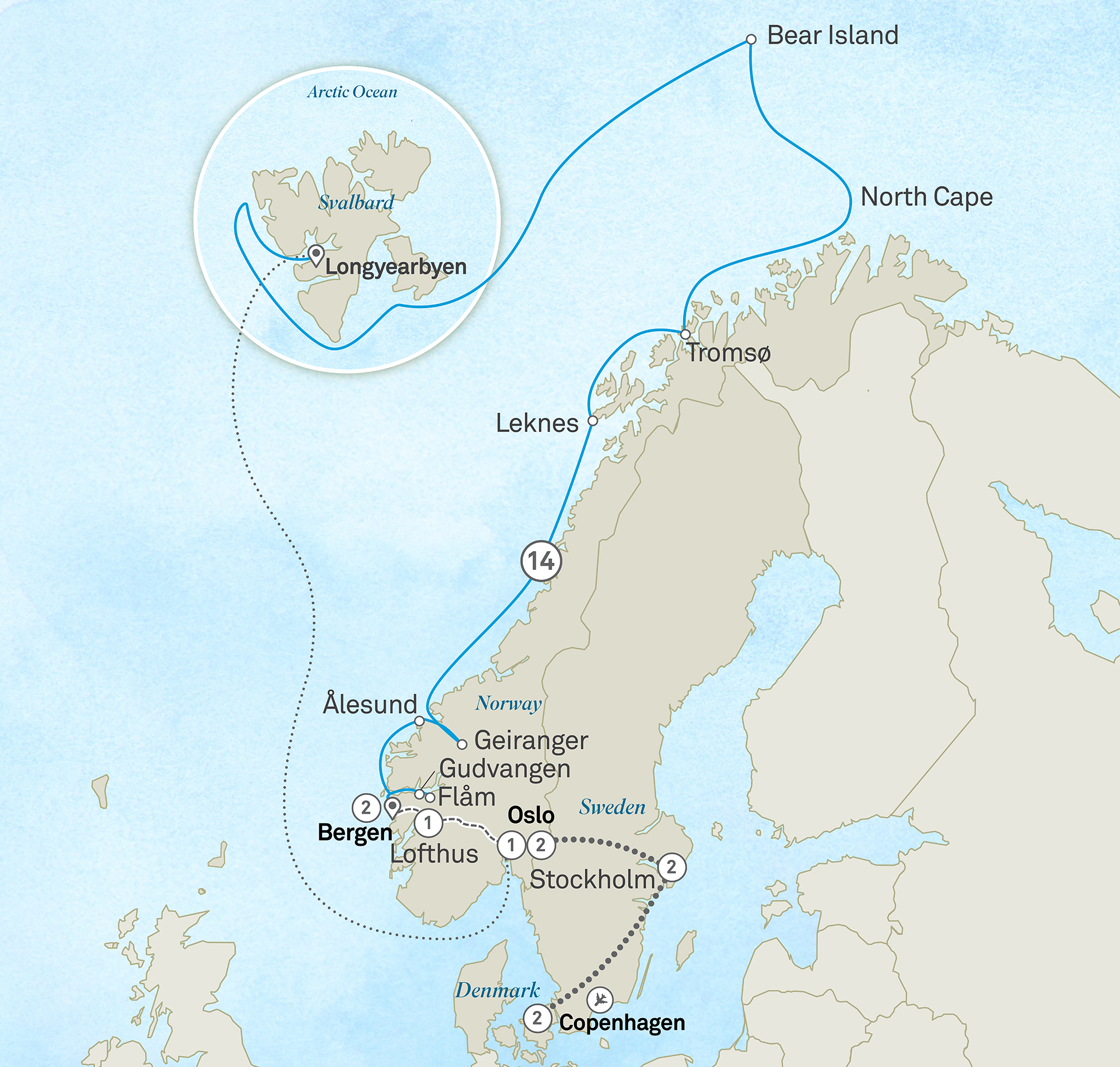 Experience the ultimate journey through Scandinavia, where culture, history, and breathtaking natural beauty come together in a seamless blend of land and sea. From the storybook cities of Denmark, Sweden, and Norway to the dramatic fjords and untouched Arctic wilderness of Svalbard.