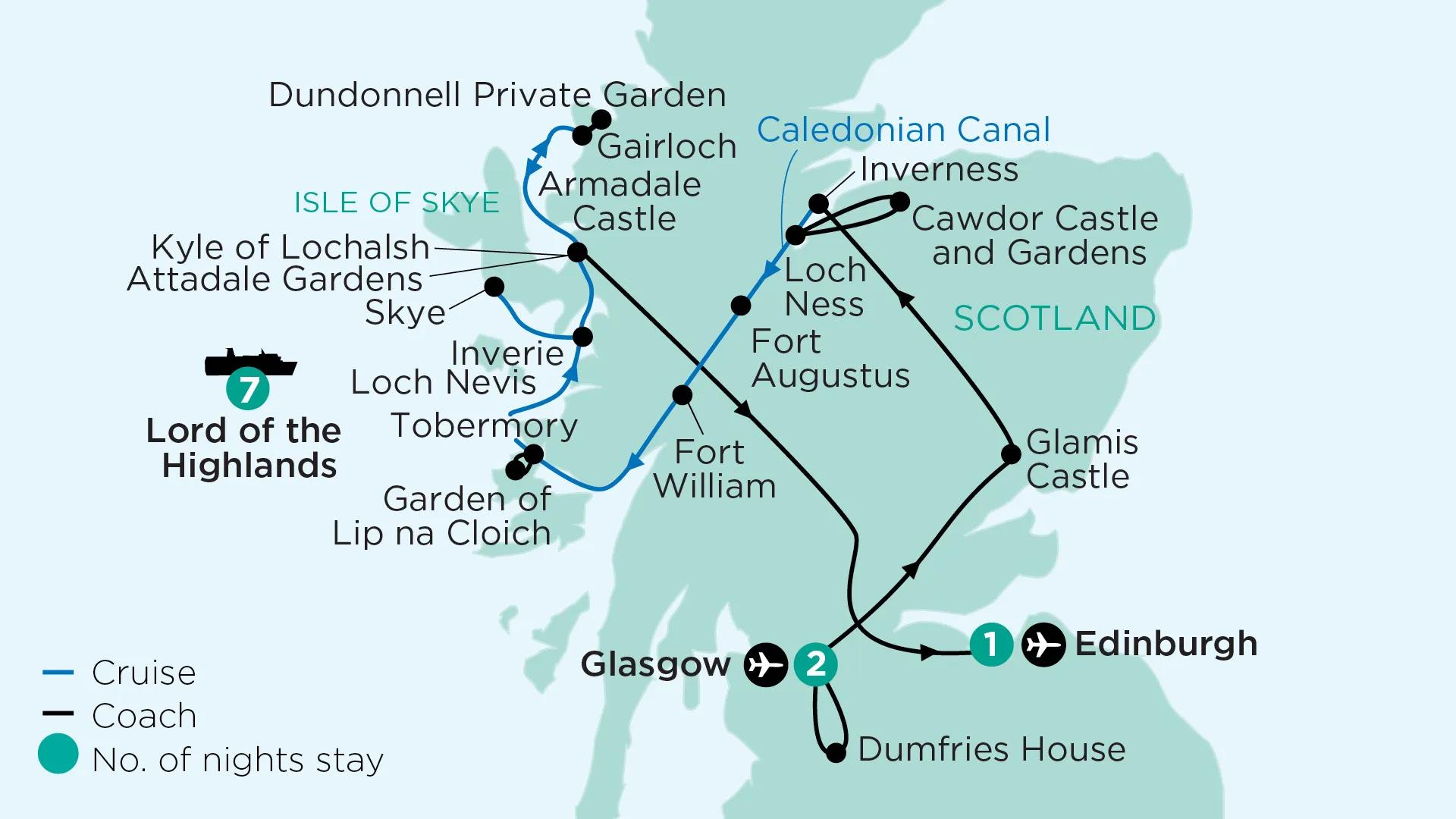 Join our exclusive charter of the Lord of the Highlands small ship, cruising the famed lochs and canals of Scotland. Visit the remote villages, castles and gardens of the Scottish Isles, absorbing the dramatic scenery of the Isle of Skye and the Isle of Mull. Our boutique vessel also navigates the Caledonian Canal to arrive at legendary Loch Ness. Before our cruise, we also gain an appreciation for the royal garden of Dumfries House.