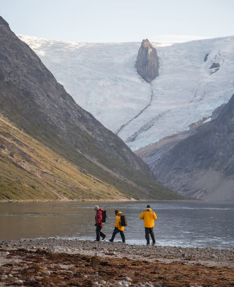 As we approach and arrive in Greenland, the first natural features you’ll see will be the towering steep-walled fjords and hanging glaciers. We’ll explore the uninhabited east coast. This area offers opportunities for wildlife sightings, including the possibility of polar bears and humpback whales. Activities include heli-landings, hiking, paddle excursions, Zodiac cruises, and shore landings in this remote, ice-laden landscape of tumbling glaciers, alpine vistas and wildlife. We set out for the wild fjords of the uninhabited east coast, one of which is Lindenow Fjord, also known by its Greenlandic name, Kangerlussuaq. Thousands of years ago, groups of PaleoInuit hunters and fishermen made their home in these isolated fjords, living off the land and surviving mostly on the resources provided by the sea—long before the arrival of European explorers and successive waves of migration prompted mass settlements. Traces of these early inhabitants can be found today against the backdrop of cascading glaciers and steep–walled mountains. The fjords are where you can observe plenty of wildlife, especially marine mammals. Rare sightings of polar bears are also possible as they drift down from the north on sea ice floes propelled by the East–Greenland current. Humpback whales are often sighted when entering f jords as the shallowing seas bring an upwelling of nutrients to the surface. While we keep our eyes peeled for wildlife, the magnificent alpine terrain invites us to explore by sea, land and air to immerse ourselves completely in the remote icescapes of the region. The wild east is ideal for heli landings, paddle excursions, hiking, Zodiac cruises and shore landings.