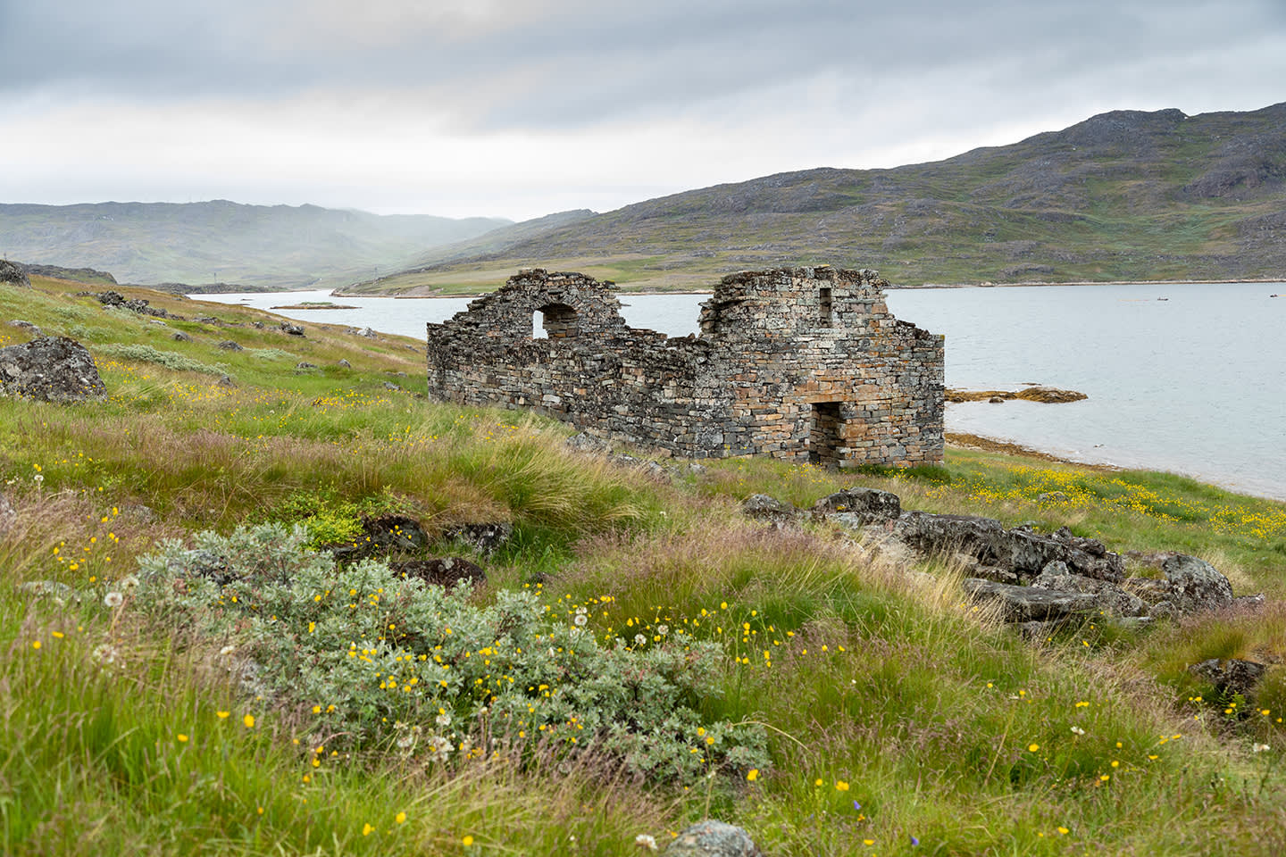The four walls and foundation of the stillstanding 14th-century Hvalsey church are considered the most iconic of all Norse ruins in Greenland. For history buffs, this site is akin to a pilgrimage. While we will have encountered Norse ruins earlier in the voyage and visited reconstructions of long-lost villages, Hvalsey evokes a surprisingly complex range of emotions— haunting, reverent, and deeply curious. Standing almost alone in an otherwise wild landscape, the Hvalsey church prompts one to wonder how civilizations can be forgotten for centuries, and then suddenly remembered. The rolling terrain of this well-chosen site, a mix of rock and vegetation, will appeal to hikers in the group.