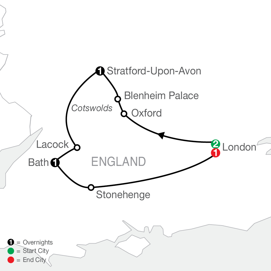Special Features Included in this Tour:• Welcome dinner in London• Guided sightseeing in London with visit to St. Paul’s Cathedral• Guided walking tour in Oxford• Visit to Blenheim Palace• Visit to Shakespeare’s Birthplace• Scenic drive in the Cotswolds• Visit to Lacock• Visit to Bath, featuring the Roman Baths• Visit to Stonehenge
