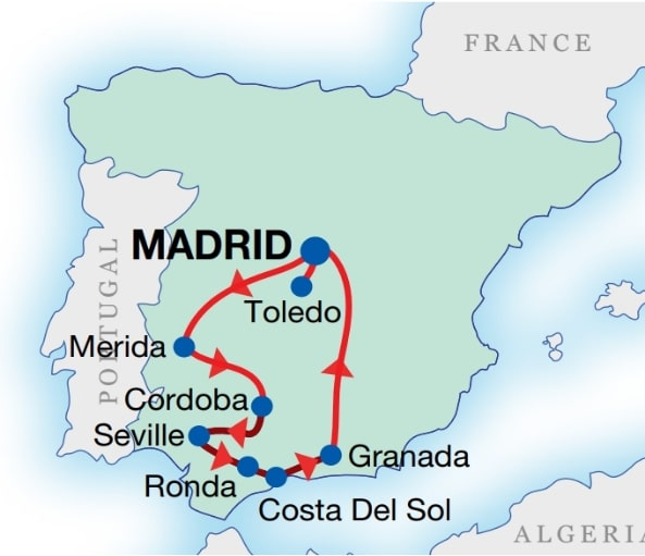 - Guided city tours with local guides in Madrid, Toledo, Cordoba (Mosque entrance included), Seville (Cathedral entrance included) and Granada (Alhambra & Generalife Gardens entrance included)