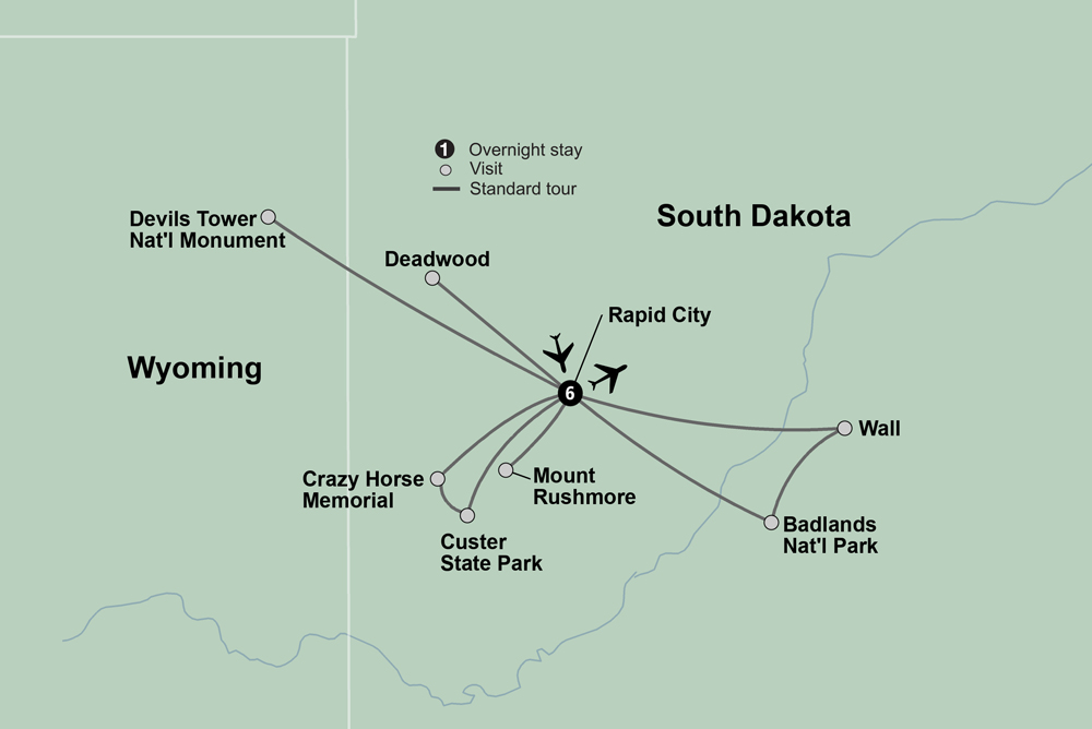 Discover the spirit of the American West and come to know the legends of the past. Discover the stories of the Lakota and Sioux through a Native American chronicler and a visit to a Oglala Lakota Living History Village. See Crazy Horse Memorial, the world’s largest mountain sculpture still in progress. Visit iconic Mt. Rushmore. Journey through the natural beauty of Badlands National Park and stop to browse at Wall Drug. Explore historic Deadwood, the former home of Wild Bill Hickok and Calamity Jane. Choose how you delve into the local history, with a tour of the Adams Museum in Deadwood or at the exhibit Tatanka: Story of the Bison. Travel the backcountry of Custer State Park on a Jeep safari. Marvel at Devils Tower, the country’s first National Monument. Rapid City is your gateway into wild landscapes and historical landmarks.