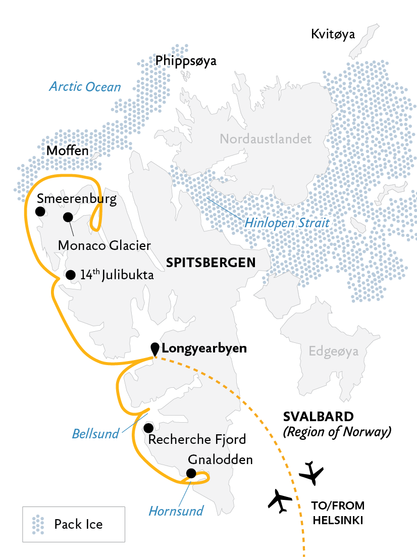 Witness the snow-covered landscapes under the Midnight SunPhotograph sea ice— and the wildlife it attractsExperience the Arctic as it “wakes up”Observe the arrival of migratory speciesSpot iconic Arctic wildlife— walruses, reindeer, Arctic foxes, and the elusive polar bearExplore Svalbard on an ice-class polar vessel.