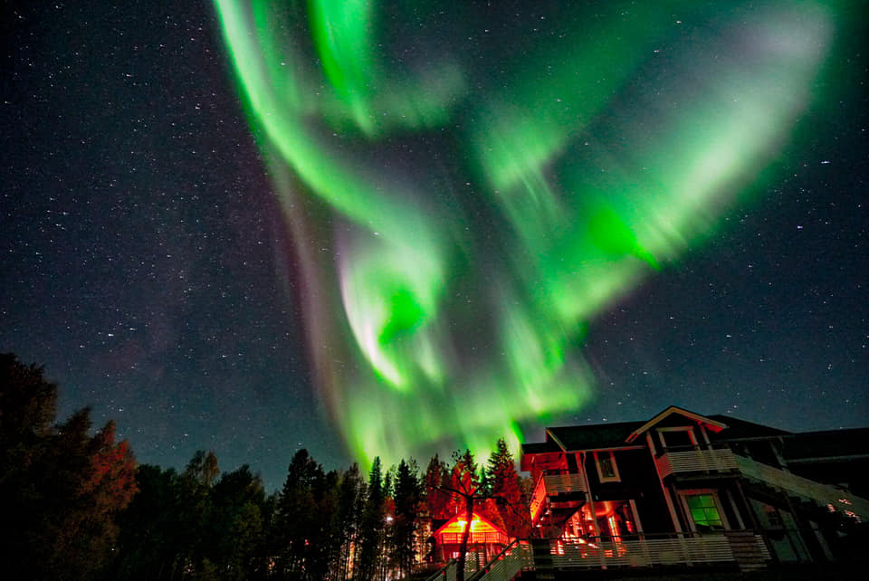 One of the best places to experience the Northern Lights is in the remote area of the Lapland Guesthouse, far out in the forest on a cold winter night in the serene Arctic wilderness.