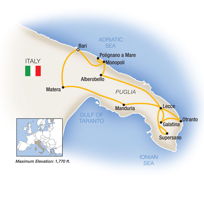Explore the long heel of Italy's boot to discover sights, tastes, and gorgeous seascapes you'll find nowhere else... like Matera, where the Sassi houses are caverns and the streets are sometimes the roofs of other houses... Trulli houses, tiny fairy castles made of limestone slabs, built without mortar... Discover Renaissance frescoes in Galatina. Stay multiple nights in "masserias," fortified 16th-century farmhouses turned into elegant hotels. Enjoy wine and olive oil tastings at vineyards yet undiscovered by the maddening crowds… tour of a medieval castle enticing with soul-stirring views and wines… and meals tempting with bounty of the sea and land...What's Included