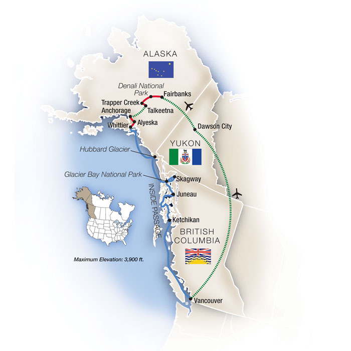 A humpback whale surfaces suddenly into the sparkling air... a tidewater glacier calves into the sea... a majestic bald eagle soars silently in a cloudless sky... snow-clad mountains tower over deep blue rivers of ice... forested landscapes and glistening fjords of the 49th state reward with priceless treasures... and just beyond, the Yukon unfolds with its own wonders – where the Tombstone Mountains rise in jagged silhouette above golden tundra, and caribou roam freely across vast, untouched wilderness. Here, under the midnight sun or the ethereal glow of the aurora borealis, nature's grandeur knows no bounds. Embark on an extraordinary journey through the rugged beauty of Alaska and the storied landscapes of the Yukon Territory on an adventure that takes you from the cosmopolitan charm of Vancouver to the historic heart of the Klondike Gold Rush in Dawson City. Experience the rich cultural tapestry of the Tr'ondëk Hwëch'in First Nations, delve into gold rush history at the Discovery Claim National Historic Site, and explore the engineering marvel of Dredge No. 4. Traverse the majestic Denali National Park, where you may encounter moose, caribou, and grizzly bears amidst breathtaking tundra landscapes. Visit the Husky Homestead to meet Iditarod champion Jeff King and his spirited sled dogs. Soar over glacier-carved valleys on a floatplane adventure, and unwind at a mountaintop dinner with panoramic views. Cruise through the awe-inspiring Inside Passage, witness the calving of Hubbard Glacier, and enjoy exclusive experiences like a private whale-watching cruise in Juneau and a rafting expedition through the Chilkat Bald Eagle Preserve. This meticulously crafted itinerary offers an immersive exploration of the natural wonders and rich heritage of Alaska and the Yukon.What's Included