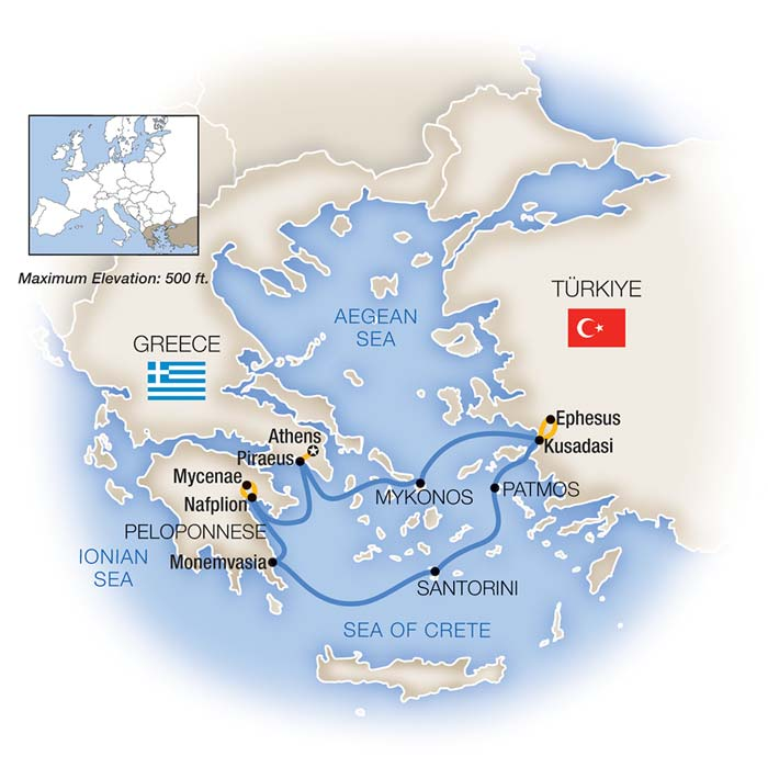 Spend two nights at a fabulous hotel in the heart of Athens, seeing antiquities that reflect its glory at the height of its power... Explore Greek Islands including Mykonos, playground of the rich and famous... Delos, holiest of all Greek sanctuaries... Santorini, eye-candy perfect with its blue-domed buildings and amazing views... Patmos, whose cultural treasures have attracted pilgrims for centuries... and Monemvasia, "the Gibraltar of the East"... plus Ephesus in Turkey, the famous remains of an ancient Greco-Roman city.