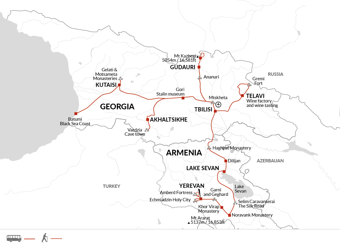 A two week journey through the wonders of Armenia and Georgia where Europe and Asia meet|Stay in the shadow of Mount Ararat and uncover Armenia's tempestuous history|Visit Georgia's diverse cultural sites from churches to cave cities