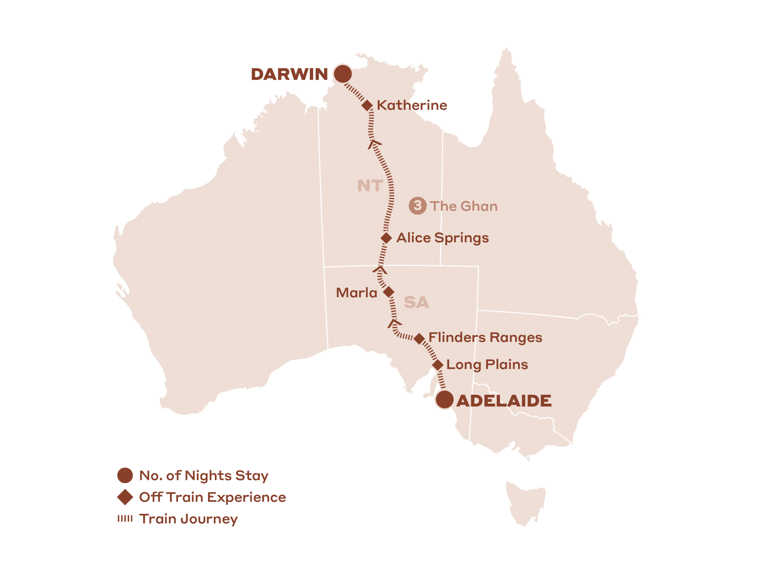 - 4 days / 3 nights aboard The Ghan, travelling from Adelaide to Darwin