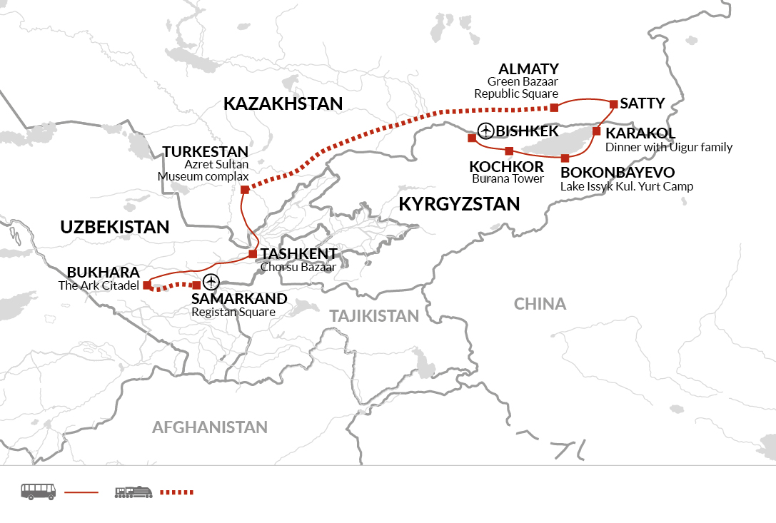 Embark on a two-week journey to explore the highlights of three of the most popular stans along the Silk Road|Meet local villagers in the countryside of Bukhara and admire the beautiful madrassas and mausoleums of Uzbekistan|Visit the quirky city of Turkestan in Kazakhstan and discover the stunning gorges and remote villages of Kyrgyzstan