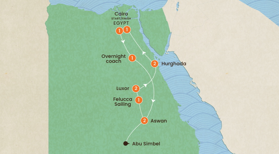 - 8 nights in hotel-style accommodation (twin or double), 1 night aboard a felucca sailboat, 1 night aboard an overnight coach