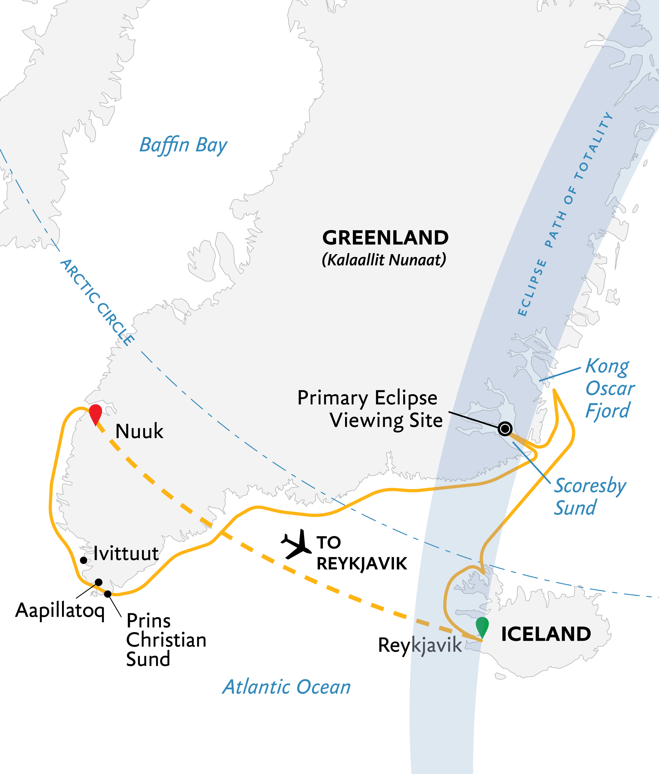 Witness a total solar eclipse from a polar ship in the High ArcticLearn about the science of solar eclipses with guest expert Michael ZeilerExplore seldom-visited Westfjords, the hidden gem of west IcelandSail across the Denmark StraitWitness the wildlife of Northeast GreenlandCruise the 110–kilometer Kong Oscar FjordEmbark in Reykjavik, Iceland, and disembark in Nuuk, Greenland, two of the world’s northernmost capital cities