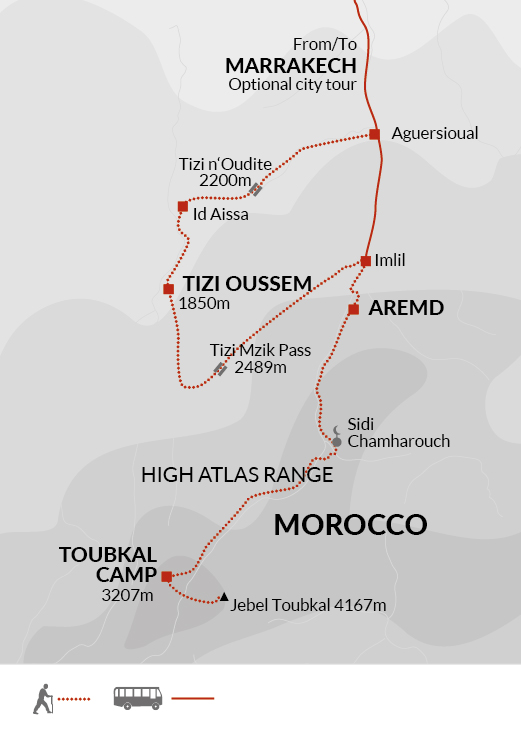 A week long trekking trip to climb the highest peak in north Africa, Mount Toubkal|Immerse yourself in the ways of the Berber communities that call the Atlas home|Explore the frantic energy of Marrakech's maze-like streets of the medina and souks