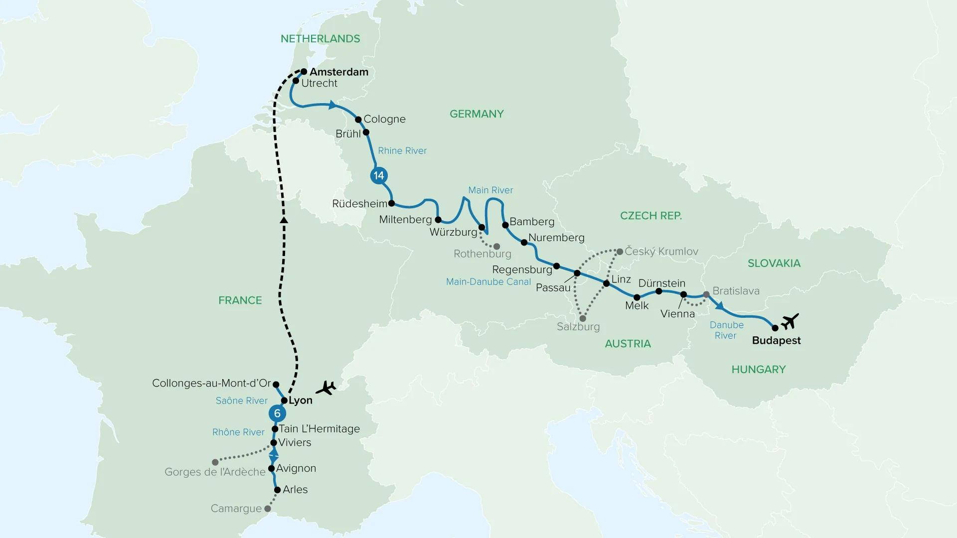Discover the highlights of Europe on this premium 21-day journey through some of the continent’s most iconic regions. Begin in southern France, where you will board the MS Van Gogh to cruise the Rhône River, exploring the historic cities and picturesque villages of Lyon, Arles and Avignon. Then, continue to Amsterdam and embark on a 14-day river cruise along the romantic Rhine and Danube Rivers, passing through charming German towns and scenic stretches of Slovakia and the Czech Republic before arriving in Vienna and concluding in Budapest, Hungary’s grand capital.