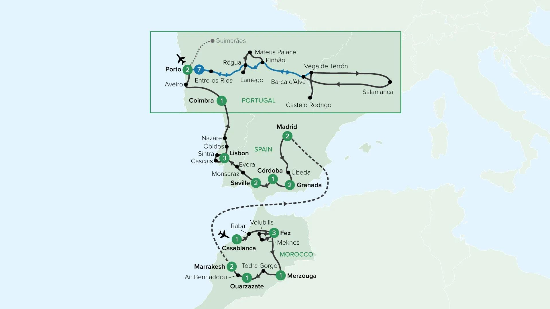 Embark on a 29-day cultural odyssey from Casablanca to Porto, weaving through Morocco’s medinas, Spain’s flamenco heartlands, and Portugal’s sunlit valleys. Sip mint tea in a Berber salon, sleep beneath Saharan stars, cruise the Douro, and savour handmade tarts and port at a riverside quinta—an immersive journey of flavour, tradition, and timeless beauty.