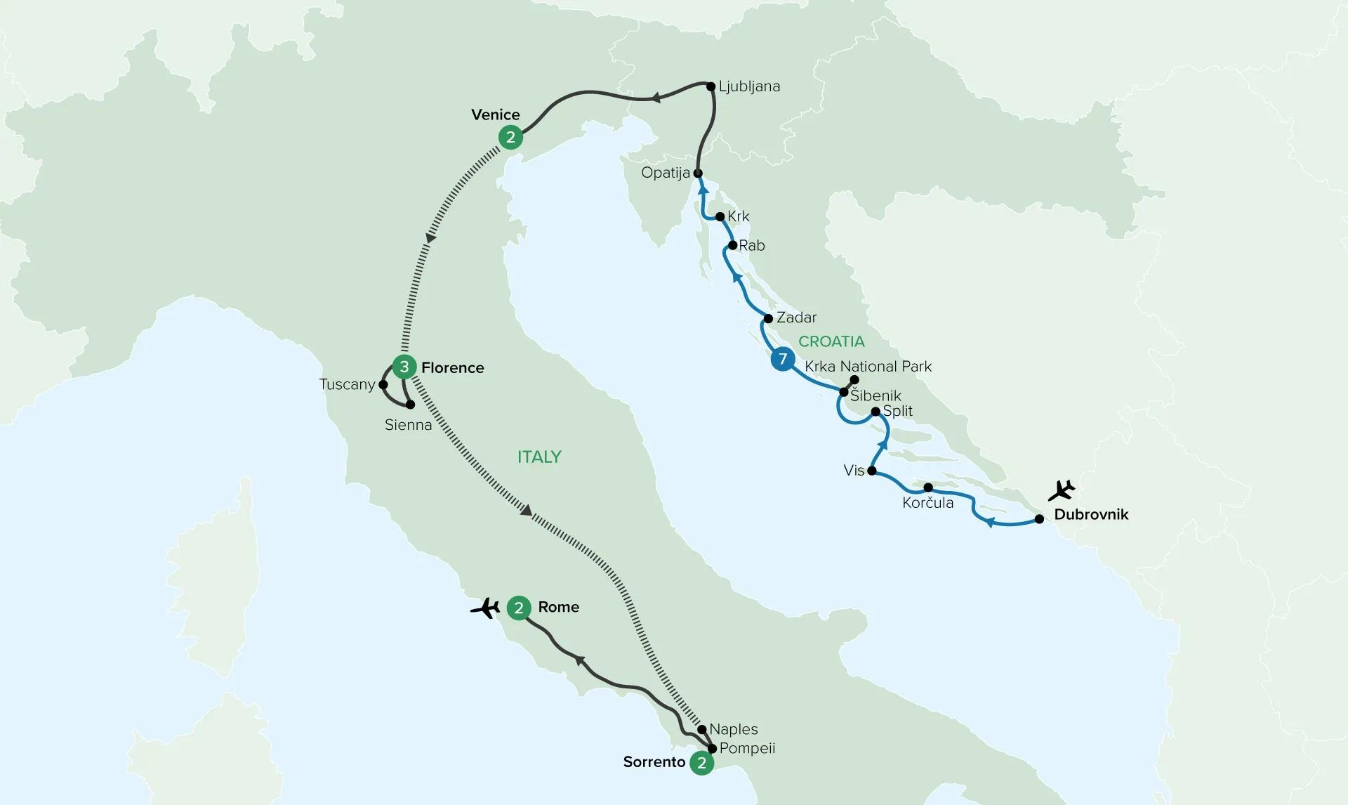 Savour the essence of Italy and Croatia on a 17-day journey from Dubrovnik to Rome. Discover timeless cities, coastal charm, and artisan traditions. From golden Tuscan hills to Venetian canals and the sparkling Adriatic, enjoy boutique stays, immersive experiences, and a luxurious cruise — where every moment is steeped in flavour, culture, and Mediterranean beauty.