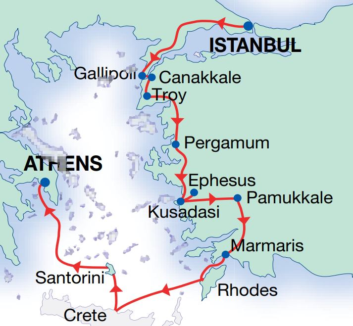 Turkey and Greece's close geographical location provides a wonderful opportunity for travellers to visit both countries on the same trip, from the historical sites of Turkey to the beautiful beaches of the Greek Islands. Our Turkey & Island Hopper tour combines Istanbul, the capital of Roman, Byzantine and Ottoman Empires; the ancient port city of Ephesus; the mineral-rich thermal waters and white travertine terraces of Pammukkale and Anzac Cove at Gallipoli with the must-see Greek islands of Rhodes, Crete and Santorini and Greece's capital, Athens.