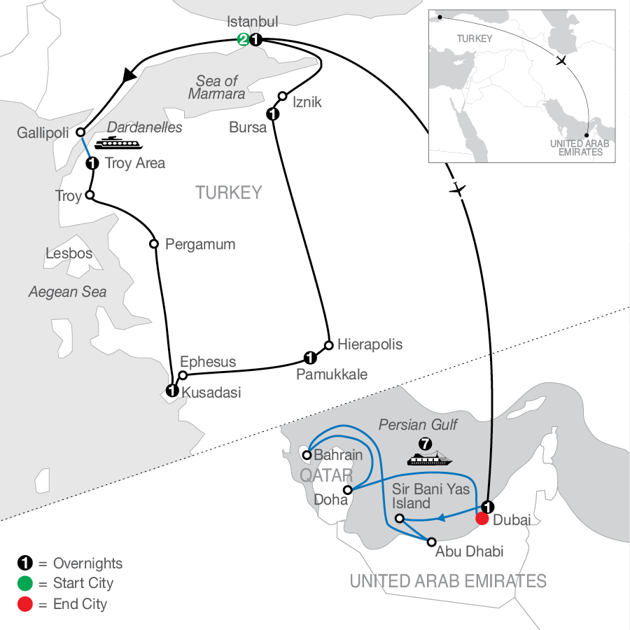 Special Features Included in this Tour:• Guided sightseeing of Istanbul’s highlights featuring visits to the Roman Hippodrome, Blue Mosque, Hagia Sophia, and Topkapi Palace • Visit to the Grand Bazaar in Istanbul with traditional Turkish coffee experience at a historical coffee roaster • Visit to the WWI battlefields on the Gallipoli peninsula, the Anzac Cemetery, and the Lone Pine Memorial • Guided sightseeing of the Troy archaeological site and see the symbolic wooden Trojan Horse • Guided visit to the Asklepion at Pergamon • Guided walk through the ancient ruins of Ephesus; see St. John’s Basilica.• Visit to the ancient city of Hieropolis at Pamukkale featuring views of the travertine terraces and thermal pools.• Visit to the Great Ottoman Mosque (Ulu Camii) of Bursa, plus the Historical Covered Bazaar, and the Silk Market with Kestane Sekeri tasting• 7-night Desert Days Cruise aboard the Celestyal Journey• Port days at leisure in Dubai, Sir Bani Yas Island, Abu Dhabi, Bahrain, and Doha• Flight from Istanbul to Dubai• Dardanelles crossing by ferry