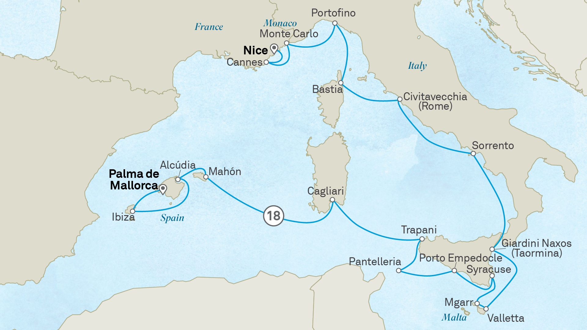 From Malta, explore Sicily’s Taormina, take in breathtaking views of the Amalfi Coast, then step back in time in Civitavecchia. Sail to Corsica’s bustling Bastia before arriving in Portofino, where pastel-coloured villas and luxury yachts frame the Italian Riviera’s iconic harbour. In Monte Carlo, immerse yourself in the refined glamour of the world’s most famous casino city. Conclude your Mediterranean exploration in Nice, where the sparkling waters of the Côte d’Azur meet a rich artistic and culinary heritage.