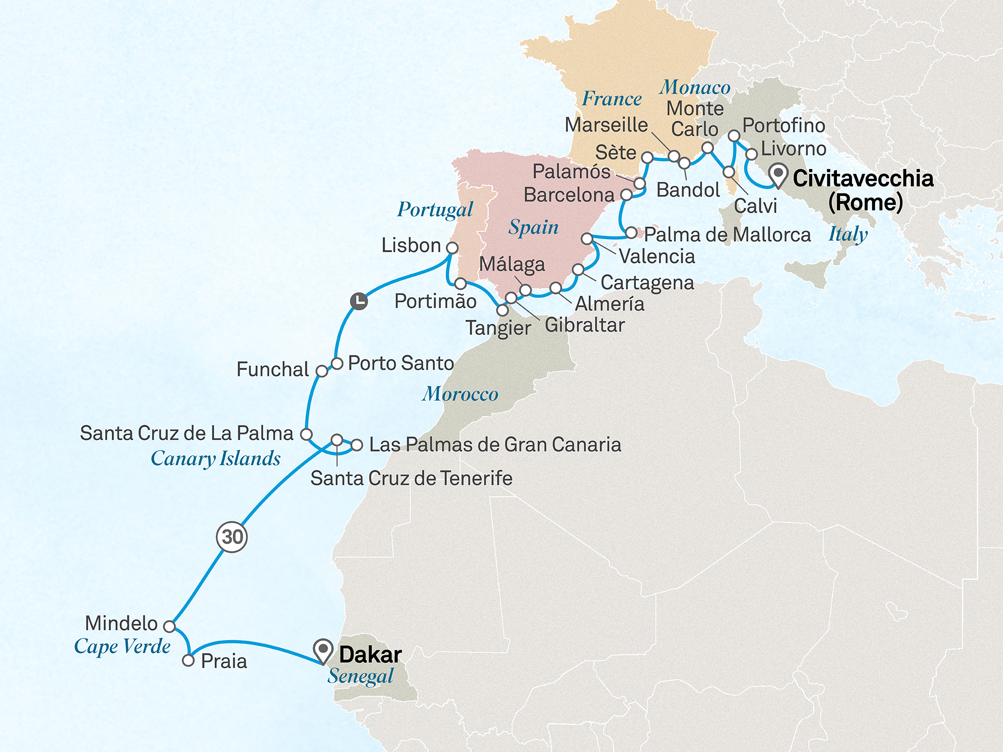 Cross the Strait of Gibraltar to Morocco’s Tangier, where Moorish and Mediterranean influences intertwine. Continue to Portugal’s famed Algarve coast, then onward to the Canary Islands and Cape Verde, where volcanic beauty and glorious beaches meet rich cultural fusion.