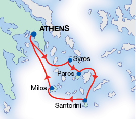 - 3 nights accommodation in Athens, 2 nights in Syros, 2 nights in Paros, 3 nights in Santorini, 3 nights in Milos