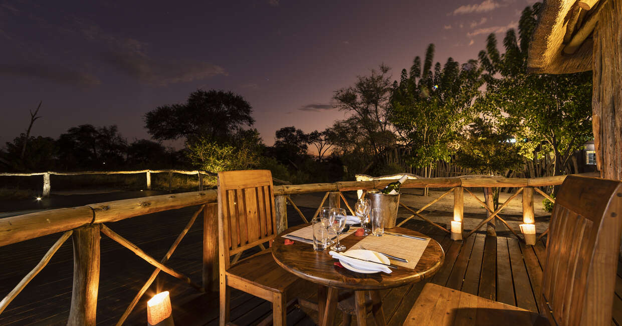 Our lodge tonight is the magnificent Thamo Telele, set amongst a lush forest of leadwood and acacia trees, around 25 minutes outside of Maun. Each luxury safari-style tent is on a raised wooden platform with hardwood floors and an en-suite bathroom, all have outdoor showers and nature as the backdrop. The stylish canvas tents are fully equipped with twin beds, which can be converted into doubles, and air conditioning above the bed. There's also a swimming pool and a central main lounge and bar area, where you'll find comfy couches and locally designed wall art. It's a truly exceptional property.